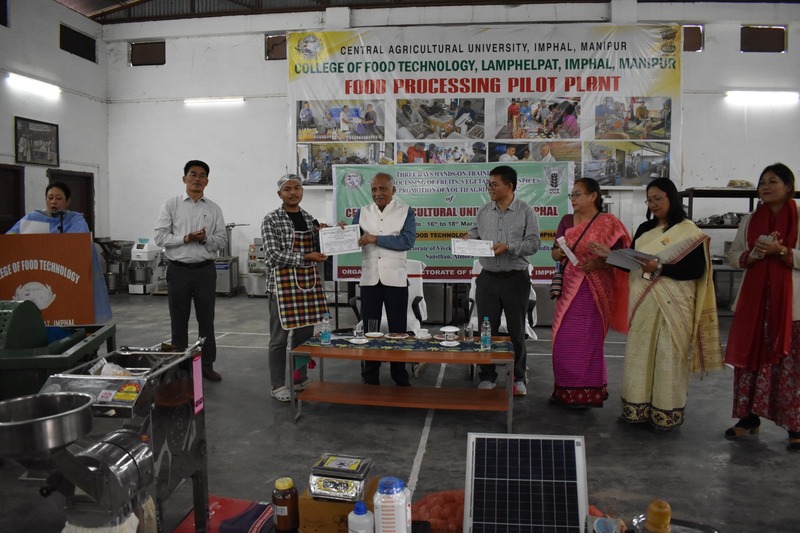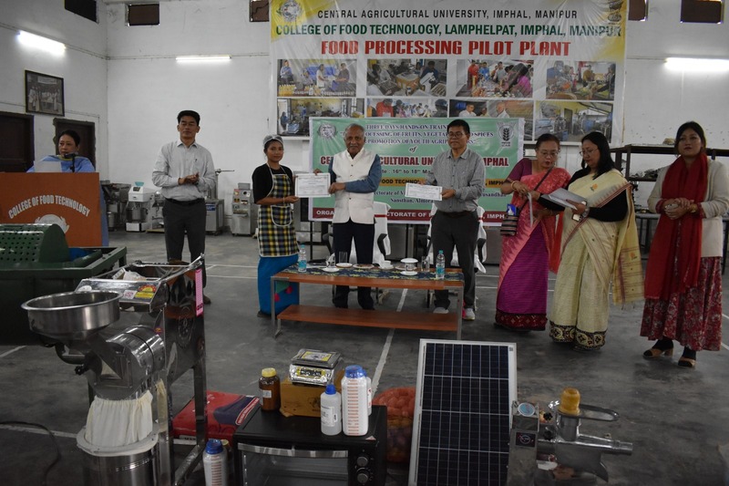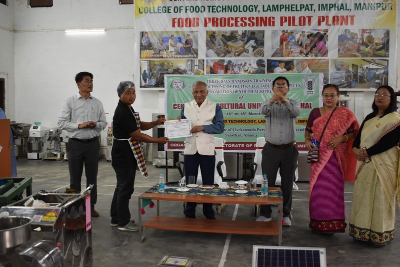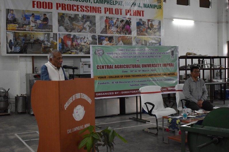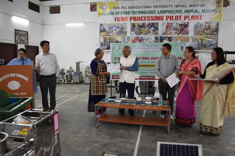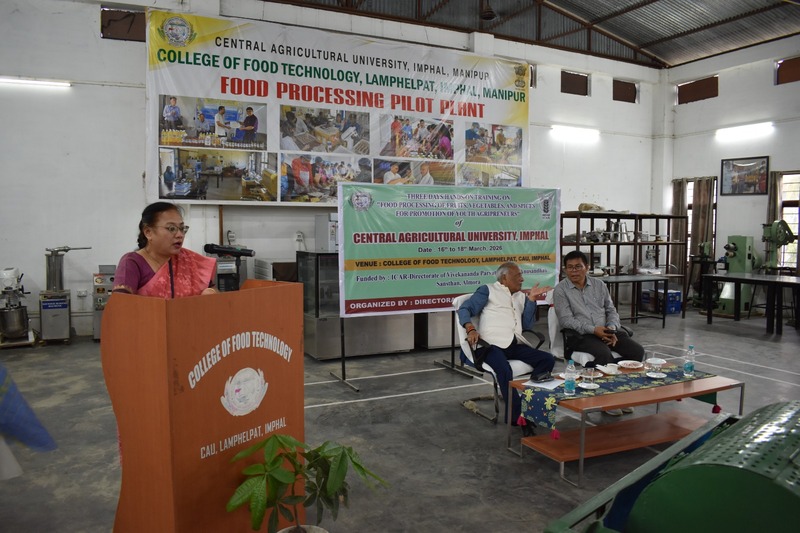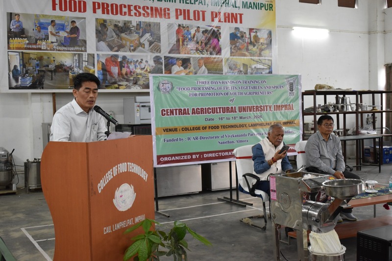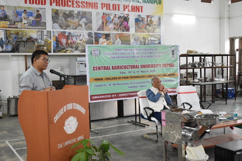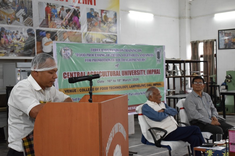 Valedictory session of the three-day Hands-on Training on “Food Processing of Fruits, Vegetables, and Spices for Promotion of Youth Agripreneurs” held on 18th March 2026 at Central Agricultural University, Imphal, in collaboration with the College of Food Technology, Lamphelpat and supported by ICAR-VPKAS, Almora. The programme was graced by Dr. Anupam Mishra, Hon’ble Vice Chancellor, CAU, Imphal (Chief Guest) and Dr. Ng. Iboyaima Singh (Guest of Honour), who emphasized skill development and entrepreneurship for strengthening rural livelihoods and empowering youth agripreneurs.